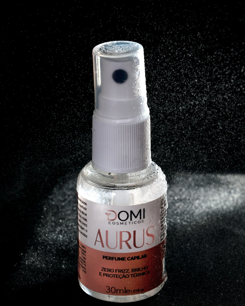 4 - Perfume capilar Aurus - O Perfume Capilar Aurus da Domi Cosméticos foi especialmente desenvolvido para conferir aroma diferenciado aos cabelos, neutralizar odores indesejáveis e ainda deixar os fios mais brilhantes. Sua fórmula contém silicones especiais que iluminam os fios e controlam o frizz. Modo de usar: Aplicar sobre os fios úmidos ou secos.