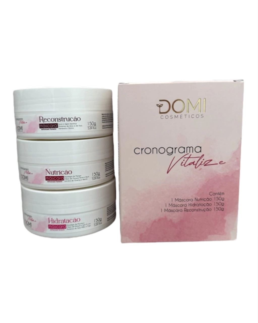A Domi Cosméticos inovou mais uma vez, descubra o segredo para cabelos deslumbrantes com o nosso revolucionário Cronograma Capilar Vitalize. Este sistema completo de cuidados capilares é projetado para proporcionar uma transformação profunda, oferecendo três etapas essenciais: hidratação, nutrição e reconstrução. Prepare-se para deslumbrar com cabelos fortes, radiantes e irresistíveis!