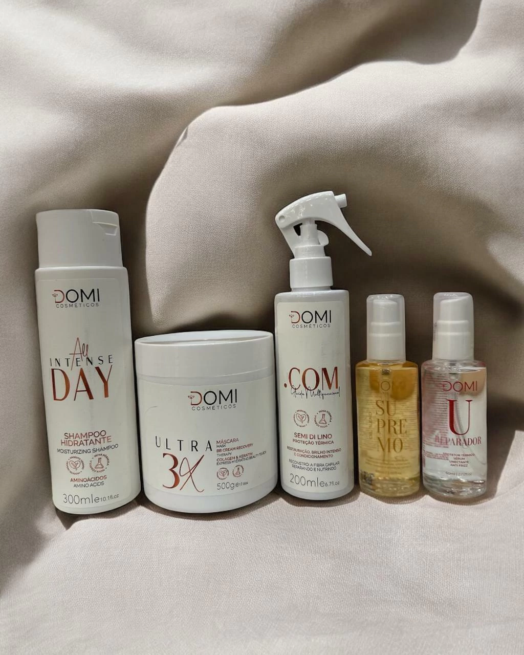 Produtos desenvolvido com a mais alta tecnologia no ramo do cosméticos. Para todos os tipos de cabelos, nossos produtos devolve vida aos cabelos. O Shampoo All Intense Day possui uma fórmula exclusiva mentolado e com ativos de alto desempenho que proporciona uma limpeza suave enquanto inicia o tratamento dos cabelos. Composto também por nano aminoácidos, Óleo de Argan e elementos essenciais que tratam os cabelos danificados e quimicamente tratados. A Máscara Ultra 3X da Domi Cosméticos foi desenvolvida para restauração total dos fios. Seus ativos de alta tecnologia resultam em cabelos hidratados, com brilho e redução do volume. O Fluido Multifuncional .Com da Domi Cosméticos foi desenvolvido com micro partículas que penetram mais facilmente na fibra capilar. Enriquecida com nano aminoácidos, repara o cabelo danificado, reconstruindo a estrutura dos fios e reduzindo a queda. Cabelos macios e com brilho intenso. O U Reparador da Domi Cosméticos, Foi desenvolvido para dar proteção térmica aos fios, anti frizz e umectante. Confere reparação instantânea dos fios. Contém silicones de alta performance. Cabelos macios, sedosos e brilhantes.
