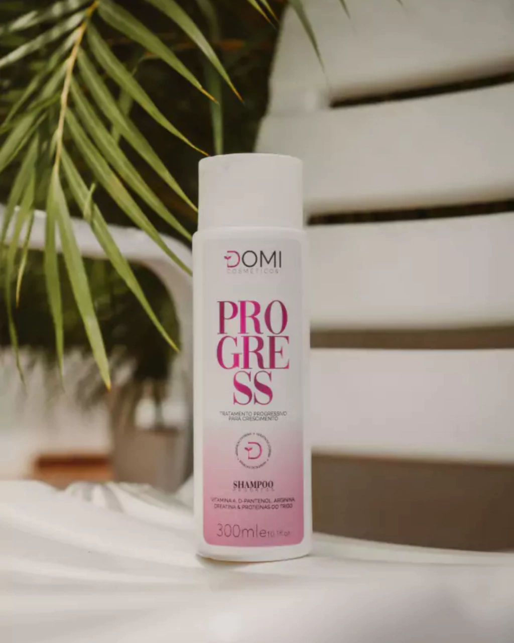 O Shampoo Progress da Domi Cosméticos rico em vitamina A que é um excelente antioxidante e estimula a ação do colágeno, aminoácidos e elementos essenciais para o tratamento de cabelos danificados. Fortalece o cabelo de dentro para fora.