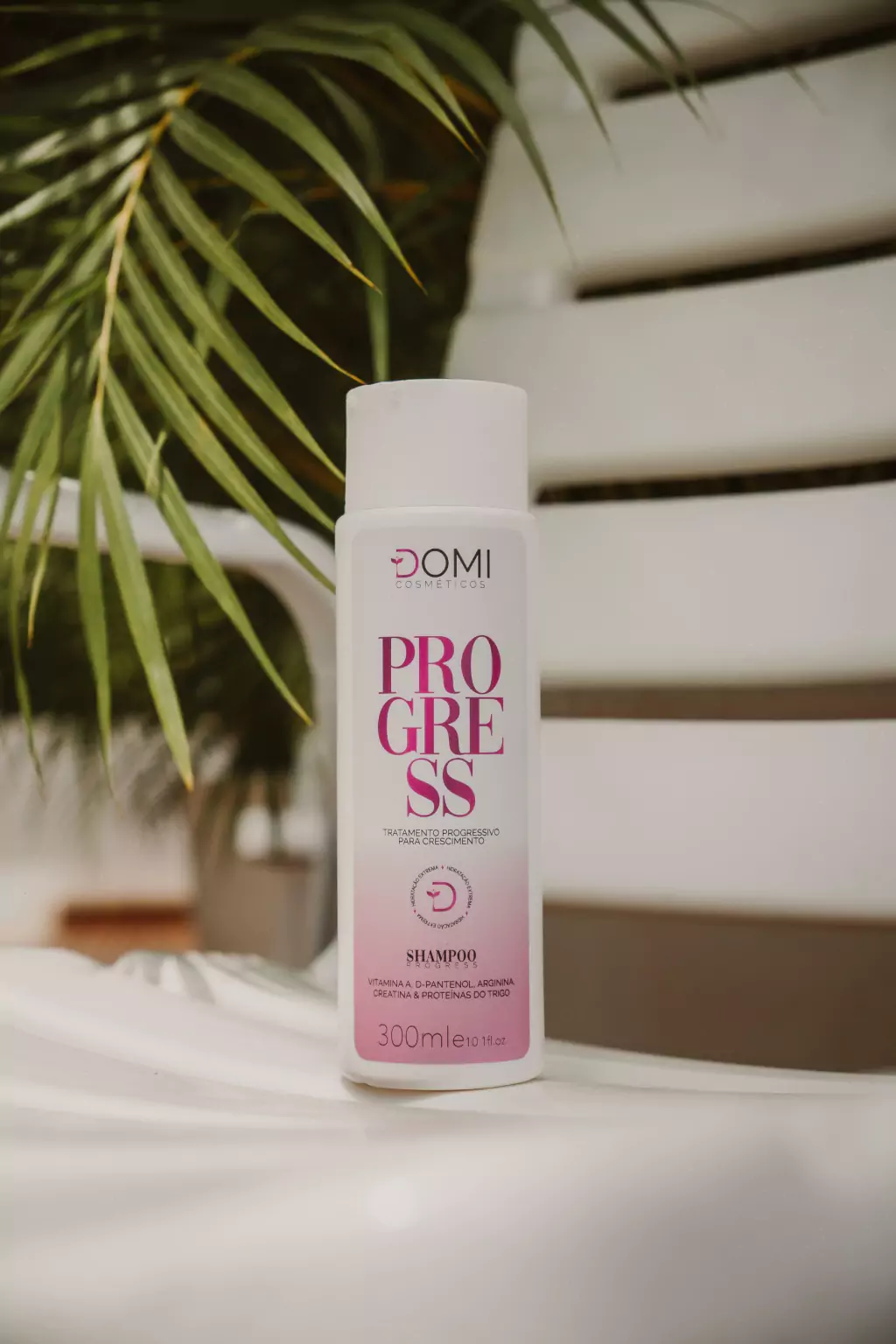 O Shampoo Progress da Domi Cosméticos rico em vitamina A que é um excelente antioxidante e estimula a ação do colágeno, aminoácidos e elementos essenciais para o tratamento de cabelos danificados. Fortalece o cabelo de dentro para fora.